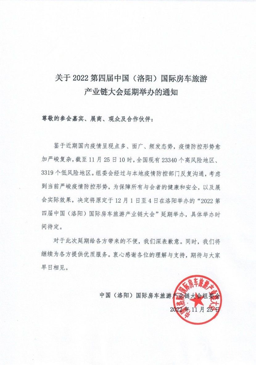 關于2022第四屆中國(洛陽)國際房車旅游 產業鏈大會延期舉辦的通知