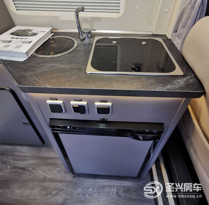 短軸房車內部往往都是采用緊湊型布局,這款也不例外。駕駛艙1+2能坐下3人,后部會客區雙人座椅全車荷載5人。前后排座椅中間設計有餐桌,內側設計為多個功能組合柜,配置也不少,有電磁爐、洗菜盆、65L車載冰箱、上部還有一臺24V直流變頻空調。