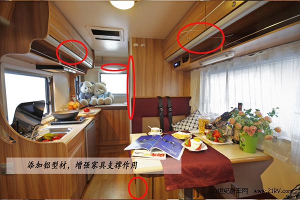 整車(chē)家具采用圓角設(shè)計(jì),避免直棱角造成磕碰。沙發(fā)、衛(wèi)生間、櫥柜、儲(chǔ)物格等有鋁型材的使用,大大加強(qiáng)家具的支撐強(qiáng)度,讓美觀(guān)設(shè)計(jì)與強(qiáng)度功能得到完美結(jié)合。頂部?jī)?chǔ)物柜,采用分割設(shè)計(jì),多儲(chǔ)物格,可以把日常使用的一些物品分類(lèi)儲(chǔ)存,而大物件可以選擇儲(chǔ)存在后部的大儲(chǔ)物箱內(nèi)。