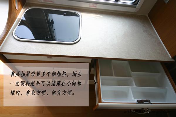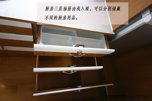 覽眾C7房車(chē)的廚房設(shè)計(jì):廚房位于上門(mén)左側(cè),洗菜盆、灶具臺(tái)、冰箱柜(上部可變身擺放臺(tái))、抽油煙機(jī)、依次排列,各種功能齊全。三層抽屜由淺到深可分別儲(chǔ)存不同的物品,廚房用品也可以根據(jù)體積大小進(jìn)行分類(lèi)儲(chǔ)存。首層抽屜設(shè)置多個(gè)儲(chǔ)物格,調(diào)料等廚房用品可以?xún)?chǔ)存在小調(diào)料罐儲(chǔ)存在此。洗菜池外部空間雖然狹小,但設(shè)計(jì)者并沒(méi)有放棄這空間,設(shè)計(jì)按壓式儲(chǔ)物格,對(duì)于一些筷子或者洗碗用品等小物件可以?xún)?chǔ)存在此。廚房上部?jī)?chǔ)物柜設(shè)計(jì)紙抽放置口,內(nèi)部設(shè)計(jì)紙抽固定支架,大大方便了廚房?jī)?nèi)使用。廚房門(mén)口處擋板經(jīng)過(guò)科學(xué)設(shè)計(jì)搖身一變,成為下車(chē)扶手,方便老人孩子下車(chē)使用。