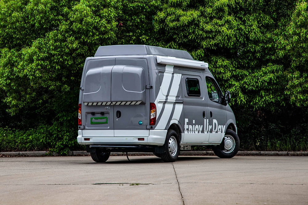 車頂采用加高硬頂設計,目的是拓展車內高度,而在車側、車尾部分我們同樣可以看到盲窗結構,最終新車的尺寸為5120x2018x2665(mm),3米以內的限高路段均可通行。
