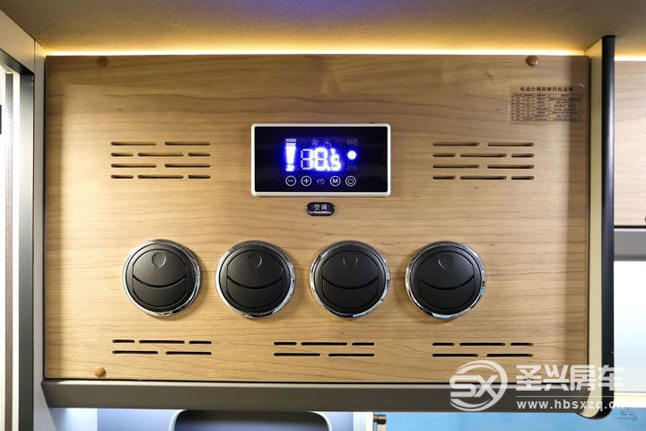 室內廚房部分設置有電磁爐、洗菜盆、65L房車專用12V冰箱,廚房上方設有220V插座和大尺寸車窗,頂棚設有一個開放式吊柜,吊柜一側是高效能24V直流變頻空調,下方是儲物格和地板落地式超大儲物柜。