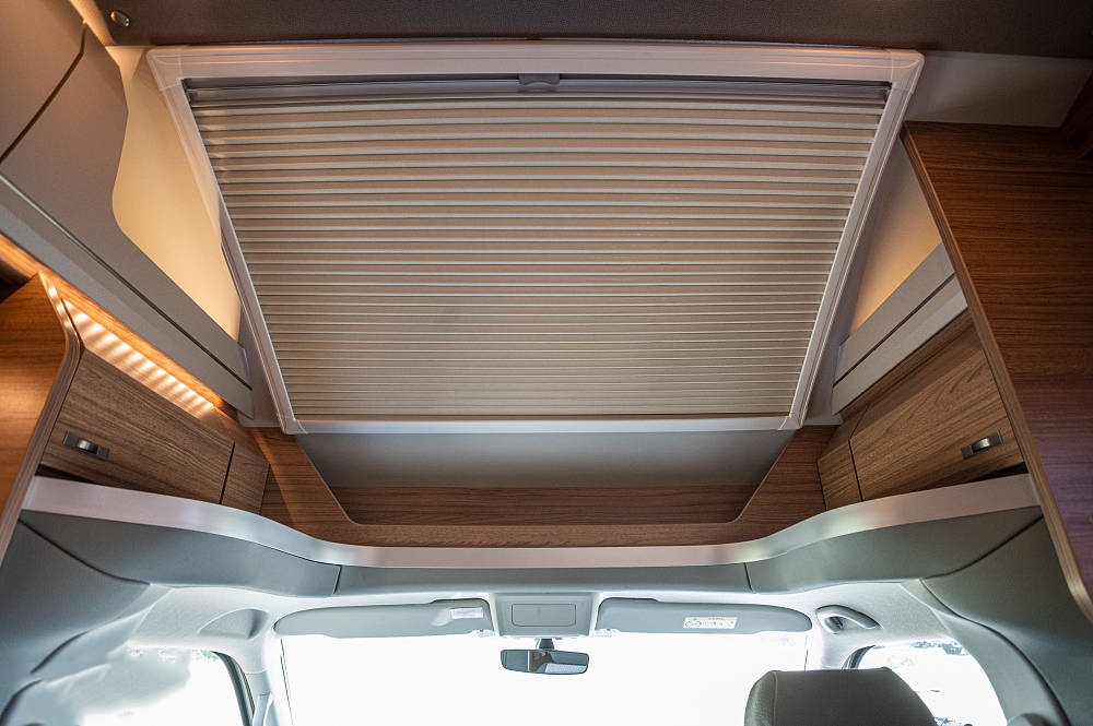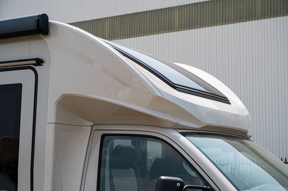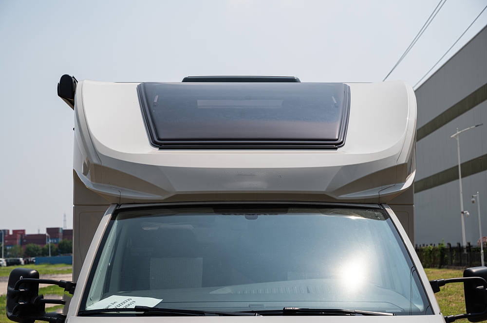 從外觀就能看到尺寸巨大的天窗幾乎占滿了整個(gè)額頭面積,這樣設(shè)計(jì)的好處不言自明,能為車廂帶來(lái)極強(qiáng)通透感,抵消長(zhǎng)時(shí)間旅居時(shí)的空間壓迫感。想象一下,當(dāng)清風(fēng)徐徐吹進(jìn)來(lái),陽(yáng)光透過天窗灑滿車廂,我相信置身其中你的心情一定不會(huì)差。