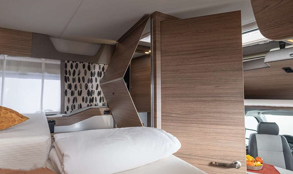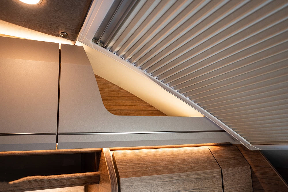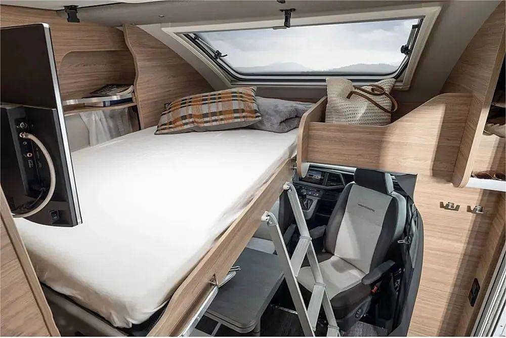 T6 MQ還提供創(chuàng)意選裝方案,卡座沙發(fā)上方可選裝一張可伸縮滑床,在房車中還是相對(duì)少見,最大效率利用空間格局,展開滑床后可滿足一名成年人休息睡眠,可作為前排生活區(qū)的獨(dú)立睡臥空間。