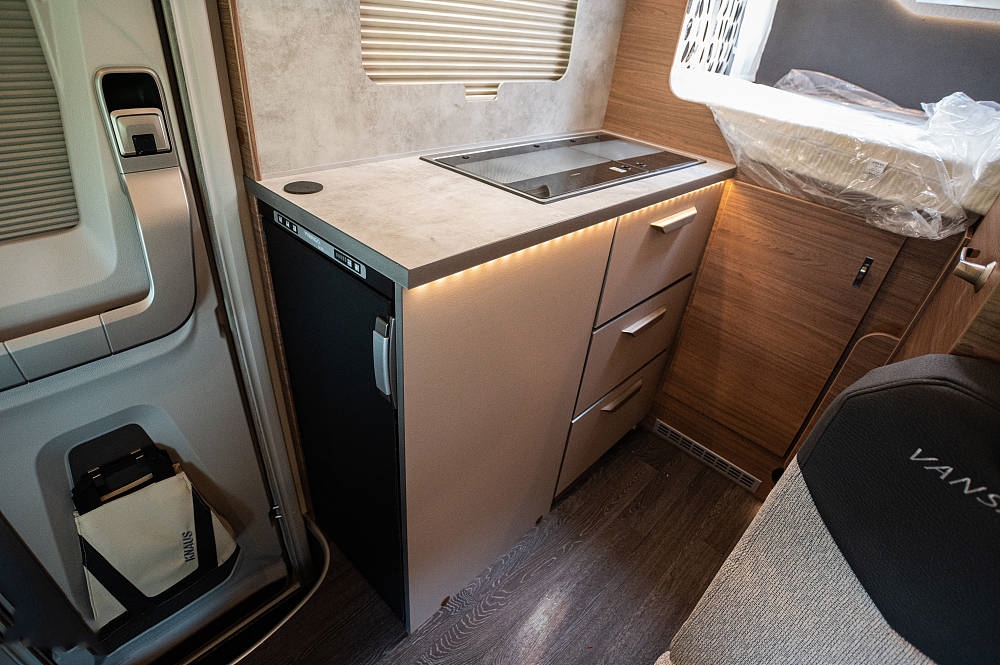 “麻雀雖小五臟俱全”用這句話來(lái)形容T6 MQ的廚房區(qū)簡(jiǎn)直太貼切了,體積小巧的操作臺(tái)內(nèi)竟然內(nèi)嵌了帶蓋板的雙眼燃?xì)庠詈拖词殖兀筮厖^(qū)域可作為日常操作的空間。