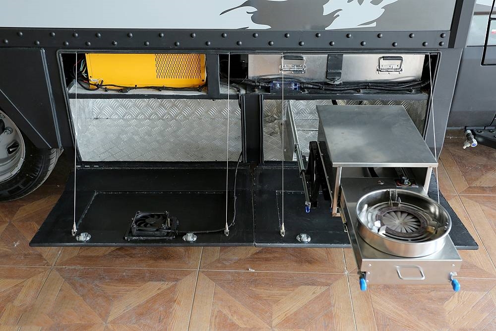 車身右側是這款車的外置廚房,全金屬的側裙同時能夠很好的保護車內的設備,外置廚房配備的是一款柴油灶,柴油來源于原車100升油箱。