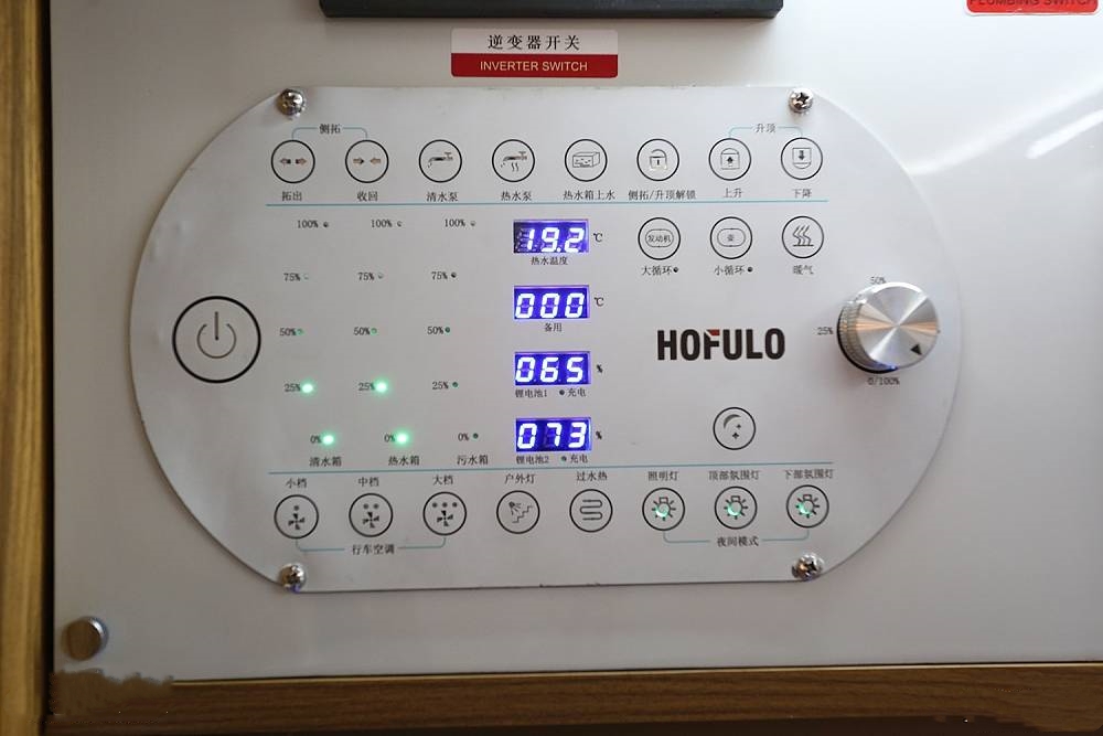 這款房車的總控制面板采用純按壓式薄膜鍵,需要長按電源鍵打開,各項功能在面板上顯示清晰,不需要過多去解釋。整車的電路部分,標配的是24V 13.4度電的鋰電池組,匹配3kW逆變器,24V發電機、600W太陽能電池板。車內最大的用電器在于空調、微波爐和空調,1.5P家用可變頻冷暖空調基本上比較省電,那么這13.4度電是相對合理的配置。
