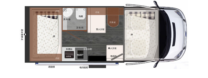 在門口處的沙發上方,裝有一臺高清液晶電視,讓你在戶外旅行的同時也不錯過精彩的電視節目。