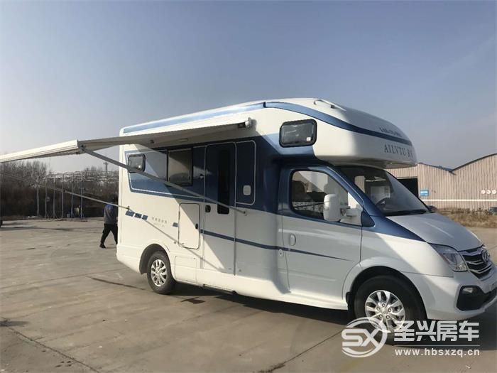 這款車的外觀主色為白色,搭配藍色拉花,整體給人優雅靈動的感覺。外部配備了:遮陽棚、外置廚房、外置儲物倉、重力注水口、市電接口等設備,功能豐富。