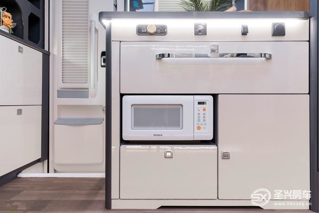 在廚房區域,車載專用冰箱保證你每天可以吃到新鮮食材。帶蓋水槽、電磁爐、多功能微波爐、抽油煙機等是你大展廚藝的好工具。廚房還有一個小窗戶,既通風透氣,又可以看窗外風景。此外高彎可調節水龍頭和獨立凈水系統,解決做飯中的水源問題,快來做上香噴噴的飯菜吧~