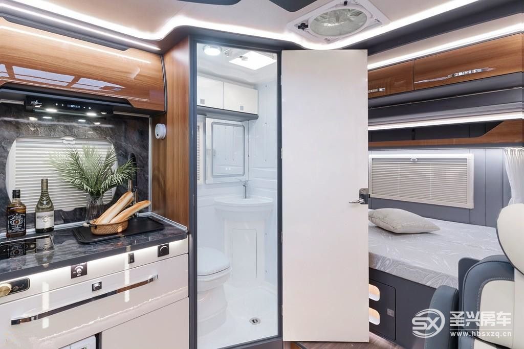 衛生間干凈整潔,裝有房車專用衛生間換氣扇,讓空氣更加流通。LED智能防霧浴室鏡,真是科技感滿滿啊。進口抽拉盒式馬桶(黑水箱 18L)、集成式豪華衛浴系統、房車專用洗手盆、防水浴簾/可折疊毛巾架,在不大的空間中,布局合理,錯落有致,有一種酒店般的感覺!