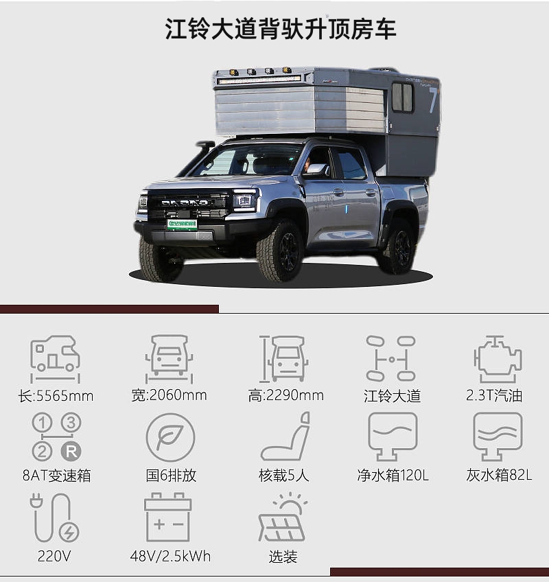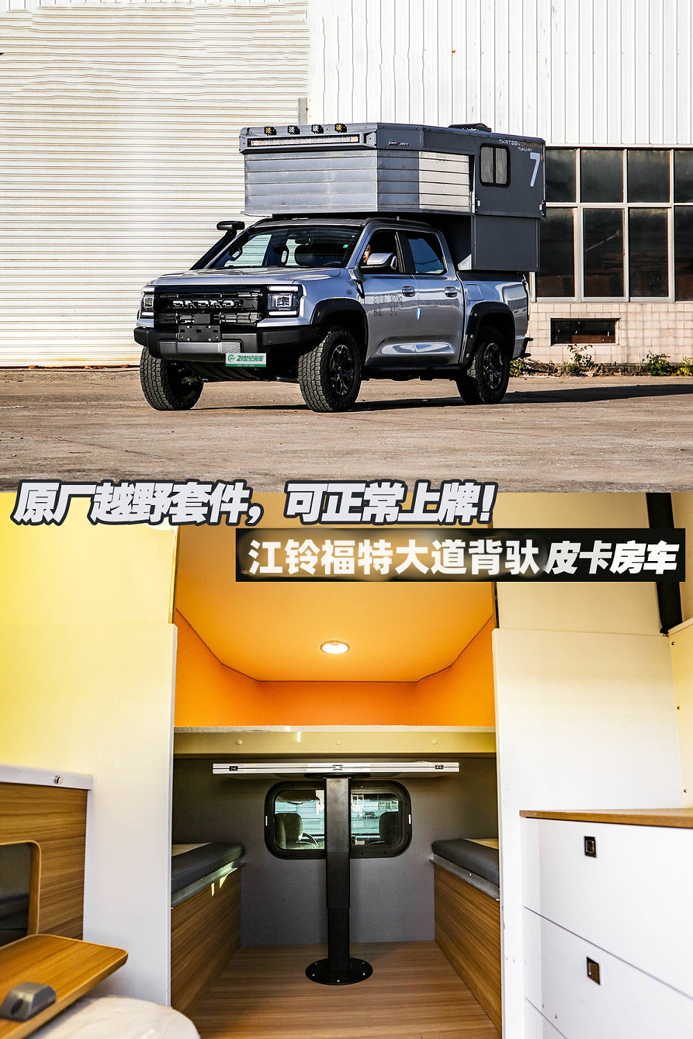 皮卡房車的好處有很多,比如自身帶有四驅系統,可以適應非鋪裝路面;相比常規底盤來說,皮卡房車車身高度適中,一些城市路段也能正常通勤。江鈴大道底盤打造出了一臺背馱式升頂房車,越野性能強悍、實用性高。