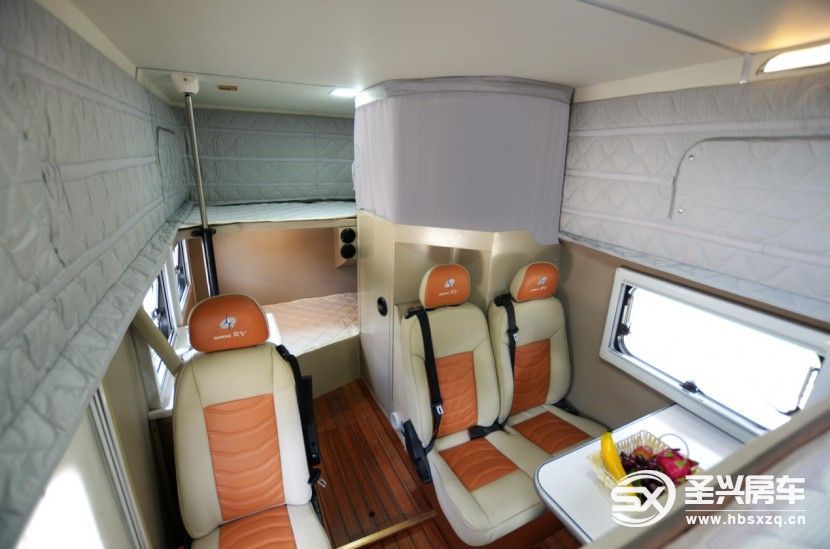 室內(nèi)設(shè)計(jì)了2+1舒適的駕駛座椅,升降頂打開的情況下額頭床可以形成一張大床1600*1800,車尾是一張上(720*1950)下(820*1950)鋪床位,整車可滿足4-5人居住。室內(nèi)還配置了廚房區(qū),固定衛(wèi)生間內(nèi)設(shè)施一應(yīng)俱全。