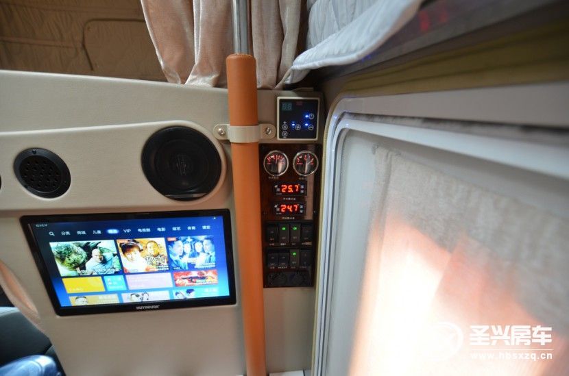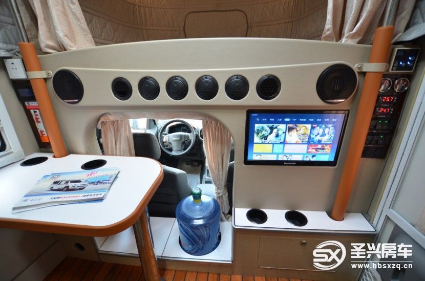 基本配置非常豐富: 4喇叭環(huán)繞立體聲揚(yáng)聲器,19英寸電視,電視接收系統(tǒng)、房車專用空調(diào)、燃油空氣加熱器、燃油熱水循環(huán)加熱系統(tǒng)、房車水電集中控制系統(tǒng),游艇級木地板、四柱直流同步電動升降系統(tǒng)、2000W充電逆變一體機(jī),房車專用天窗,專用換氣窗、鋁合金柜臺及儲物柜、室內(nèi)完善的電器系統(tǒng),太陽能充電系統(tǒng)、110升凈水箱,40升灰水箱,40升黑水箱,2000W逆變器,520Ah鋰電池,200W太陽能電池板等。