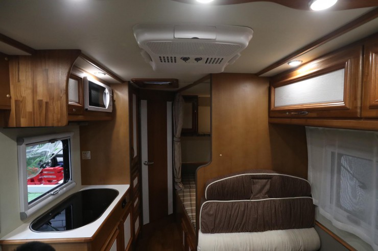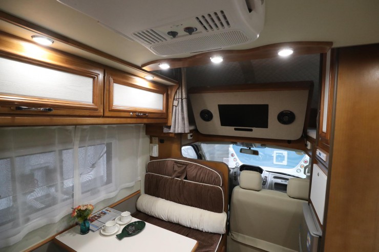 走進車廂內(nèi),實木板材打造的整體家具,讓乘客仿佛回到了自己家中。車輛格局采用的是最經(jīng)典的格局設(shè)計——駕駛艙+前額床+會客區(qū)+吧臺+廚房+衛(wèi)生間+縱置雙人床+上床。這樣的布局比較符合國人生活習(xí)慣。