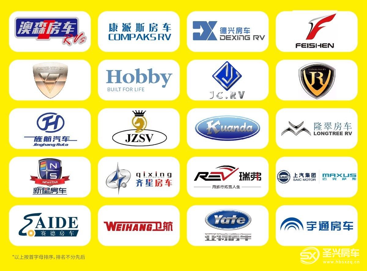澳森拖掛房車、德興房車、飛神房車、??吞胤寇?、Hobby進口拖掛、駿馳房車、江鈴房車、旌航房車、佳卓房車,寬大房車、康派斯越野拖掛、隆翠房車、齊星房車、瑞弗房車、賽德房車、上汽大通、衛航房車、新星房車、亞特房車、宇通房車。(以上排名按首字母排序)。