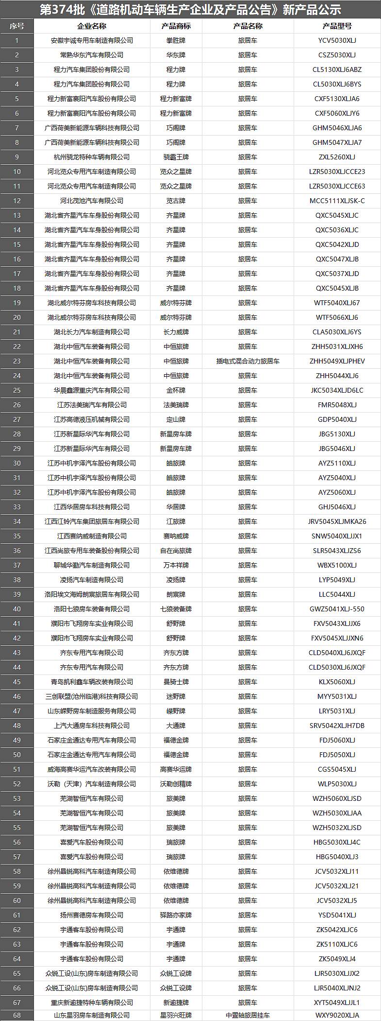 68款新車工信部公布第374批次旅居車公告