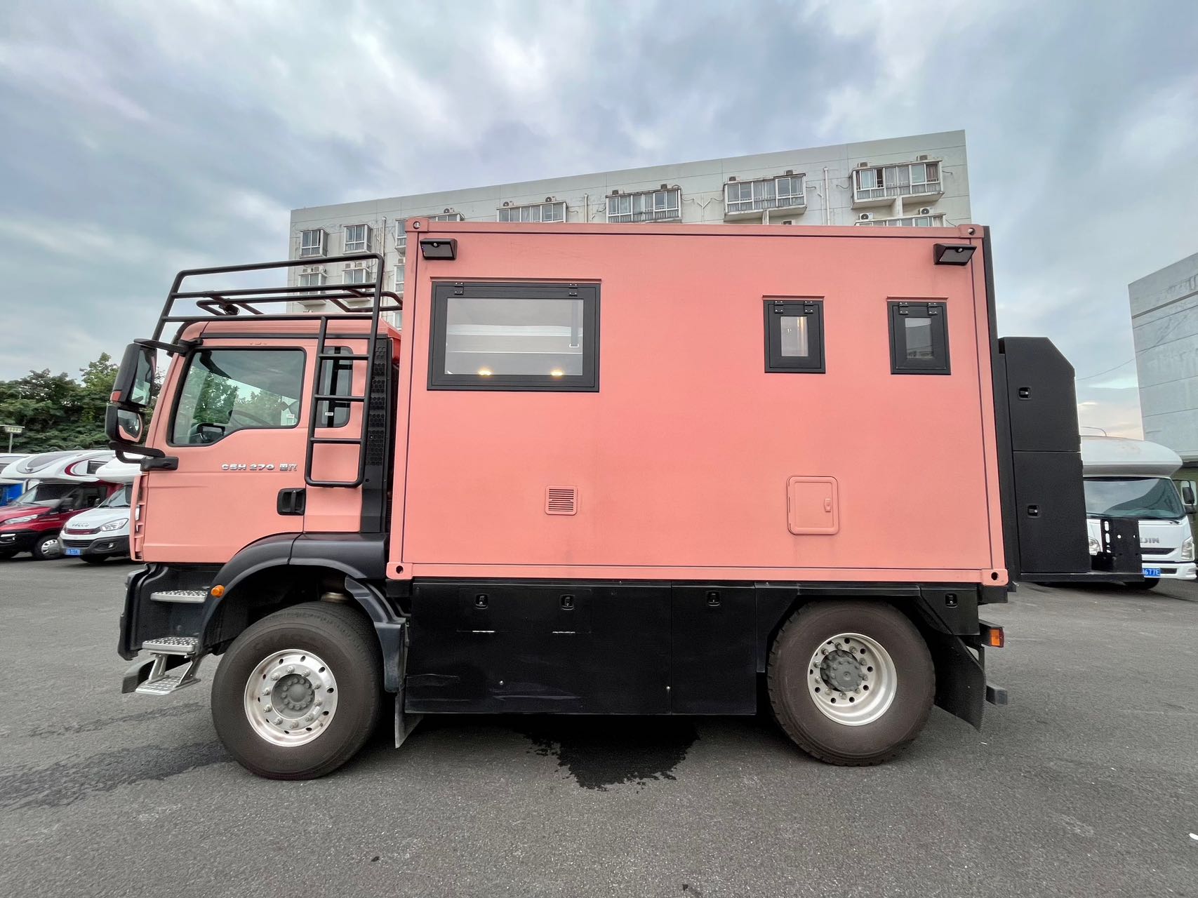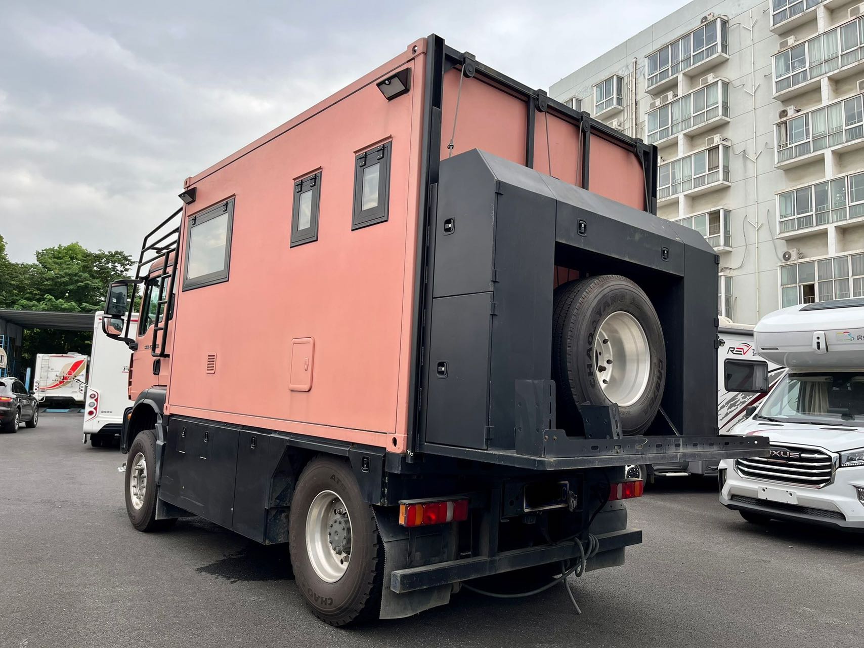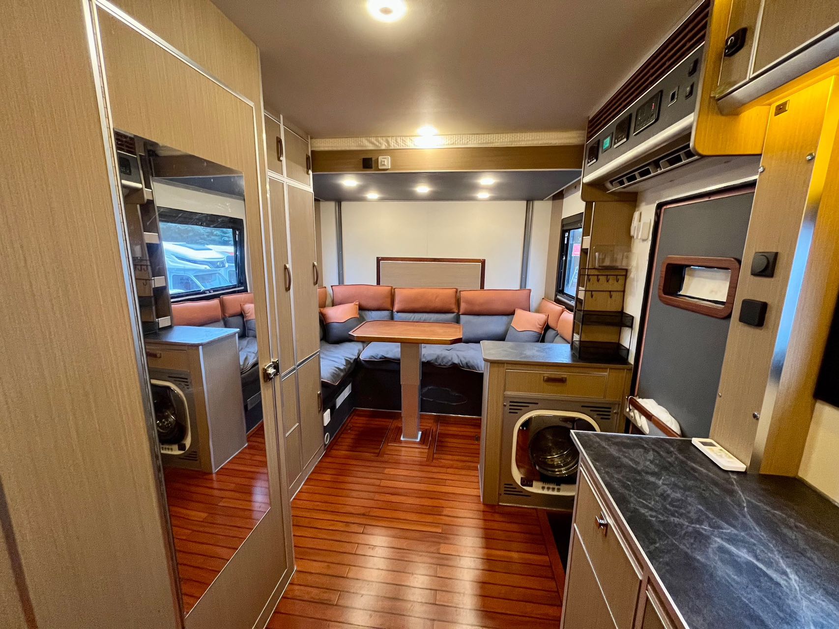【戶外配置】:220V市電接口,重力加水口,電動戶外遮陽棚,中門密碼鎖,五階上車踏步,電動升降儲物箱和摩托車架,車頂射燈