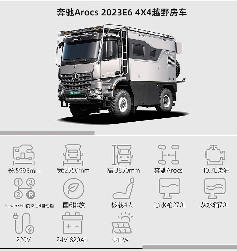 一款由奔馳Arocs 2023E6 4X4底盤改裝的越野房車,奔馳售價最貴、定位最高的產(chǎn)品,也是現(xiàn)目前房車產(chǎn)品序列中的旗艦產(chǎn)品。