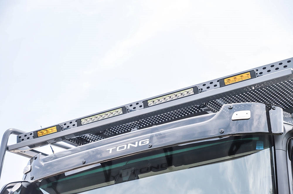車頭位置,奔馳Arocs中網(wǎng)尺寸寬裕,這會帶來更好的撞風散熱效果;大燈位置配有防護網(wǎng);頂部配備了定制防滾架,并裝配有LED照明燈帶。