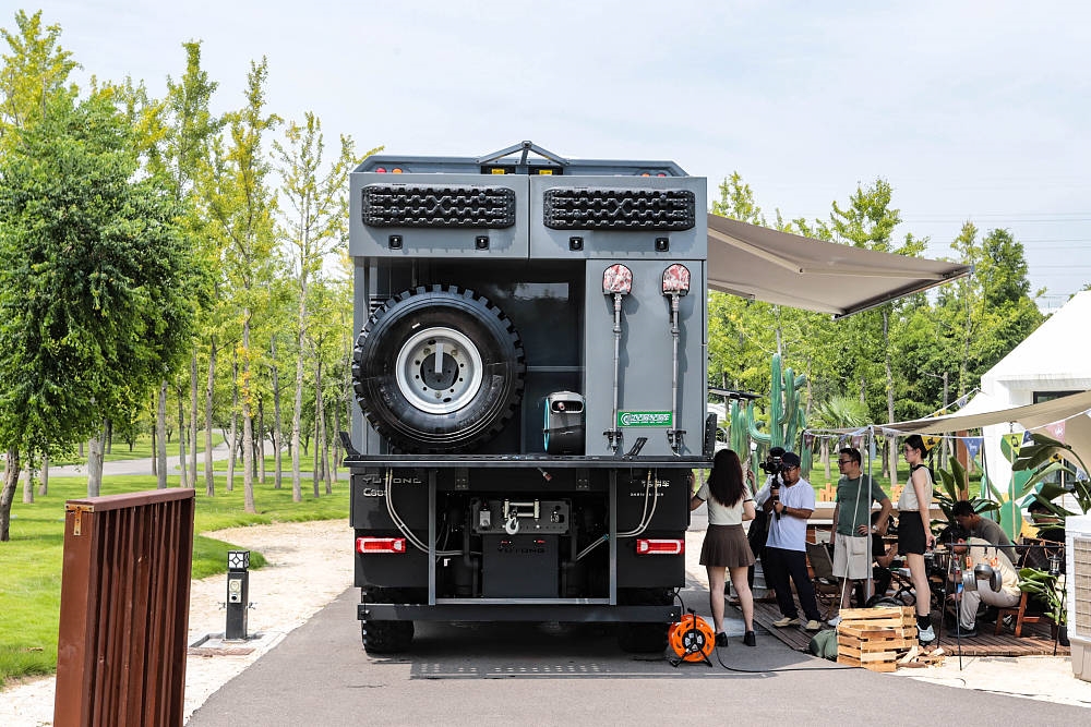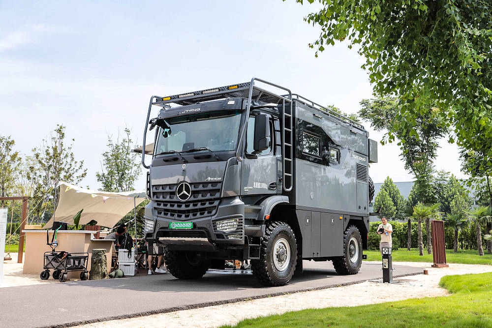 奔馳Arocs 車體采用定制增強廂體+高保溫材質(zhì),外推窗為雙層防爆鋼化材質(zhì),車外配置包括進口電動遮陽棚、外側(cè)LED照明燈帶、便攜式戶外灶具等,支持用戶戶外露營需求。