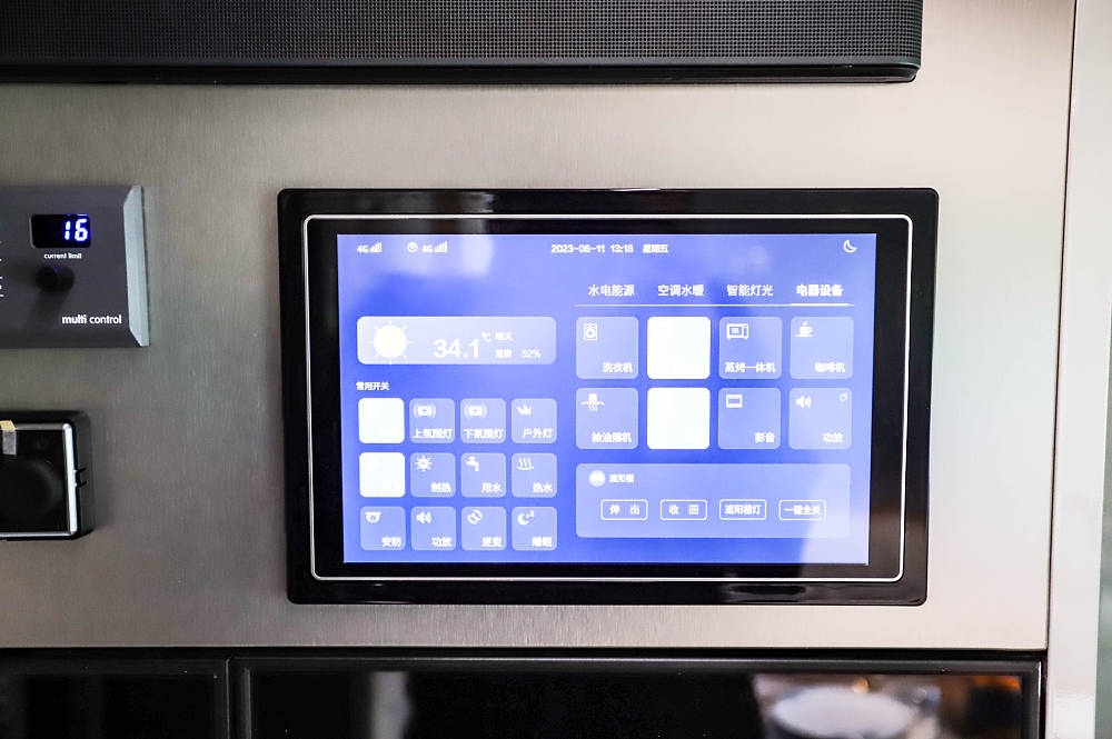 生活區(qū)中央控制模塊設(shè)置在進門附近,主要通過觸屏進行操作,一些重要的設(shè)施還能通過物理開關(guān)控制系統(tǒng)及平板控制系統(tǒng)操作,三種模式操作降低了故障情況。結(jié)合使用場景,宇通根據(jù)燈光、空調(diào)等智能家居擬定了娛樂、睡眠、布放、撤防模式,智能家居自動組合,操作方式簡單便捷。