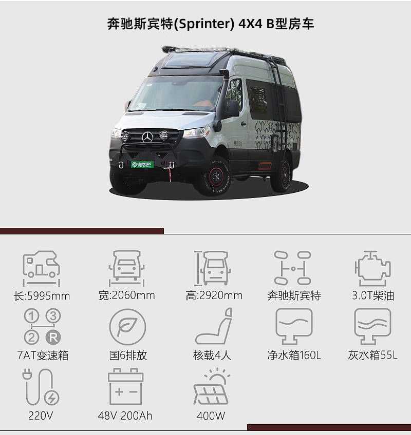 奔馳斯賓特(Sprinter)整備質量3650kg,動力上搭載3.0T柴油發動機,滿足國六排放標準,最大功率191馬力,峰值扭矩440牛·米,與其匹配的是7擋自動變速箱。另外,新車搭載了一套全時四驅系統,并帶有中央差速鎖,提升了車輛的脫困能力。