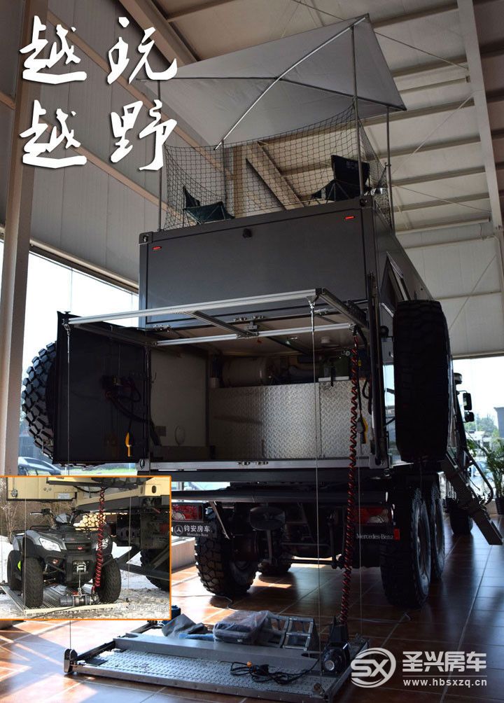 可以穿越熱帶雨林、高原山峰和沼澤濕地,甚至能抵達其他車輛無法通過的低凈空高度。后車廂內部則有熱水器,以及燃油取暖用的油箱。這一點奔馳倒做得相當細心,后尾箱空間巨大,放一臺全地形車不足話下,還擁有電動升降設備,裝卸無需費力,一鍵搞定。