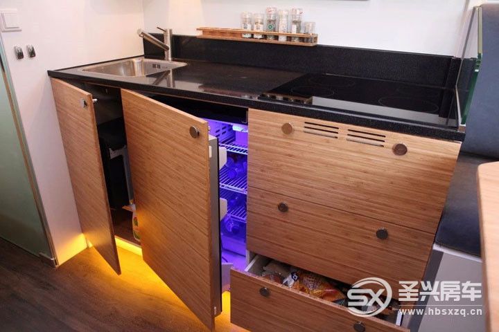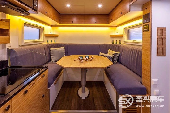 車廂內部不僅提供了所有居家設施,而且還有周密的多功能設計,為您提供一個溫馨而誘人的空間使您的旅途更加愉快。主要配有固定尺寸的舒適雙人床、一6個人的U形沙發(可轉換為一張雙人床)、設備齊全的廚房、一個寬敞的臺面與集成的電磁爐。盥洗室和浴室分開,90度的時候淋浴房門可以分隔間生活和睡眠功能區。位于床下還安置有一臺滾筒洗衣機。