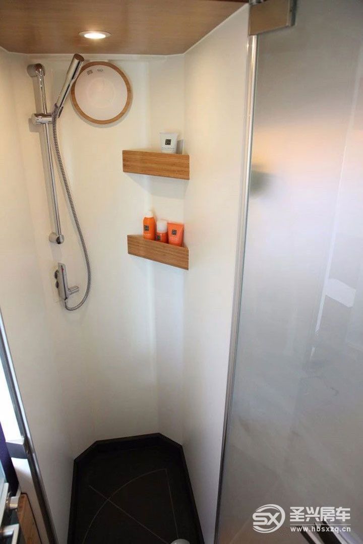 由于車輛裝備了565升的水罐,因此將不會出現清潔用水供應不足的情況。浴室與廁所均安裝了10mm厚度的鋼化玻璃門,凸顯豪華裝飾。在標準配置車型中,浴室門擁有兩種關閉位置。當以90度位置關門時,通過將(浴室與廁所之間的)通道臨時轉換為浴室空間,實際上形成了一個更衣室。這樣,可以增加浴室空間,避免浪費寶貴的內部空間。