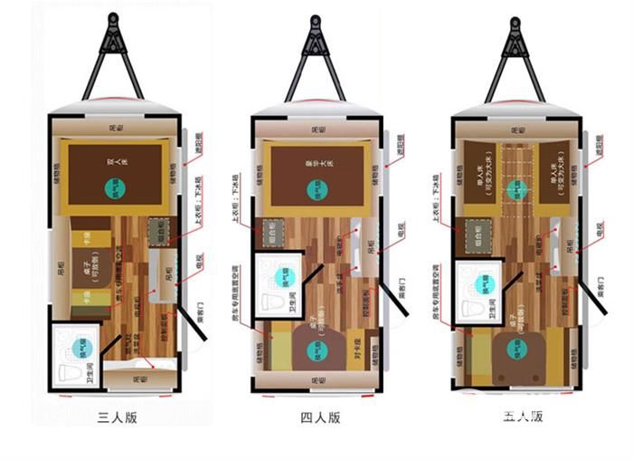 四人版布局主休息區設立于箱體前部,雙人大床:2*1.8m。會客區位于箱體后部,采用對坐式沙發卡座設計,中間餐桌可折疊,可拼為2*1.2m的床。