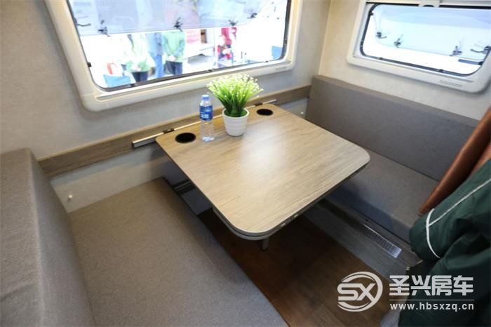 五人版布局箱體前部休息區可作為兩張單人床使用,也可以拼接為2*2米的大床,能睡下三口人。會客區卡座沙發可拼接為2*1.2米雙人床。整體可供五人休息。