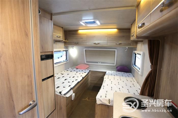 整車采用了PVC貼面板材家具,配有PVC防滑地板革、PVC防潮內飾板,高回彈床墊、房車專用底置空調。